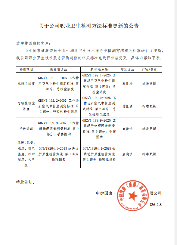 关于职业卫生检测资质变更的告知